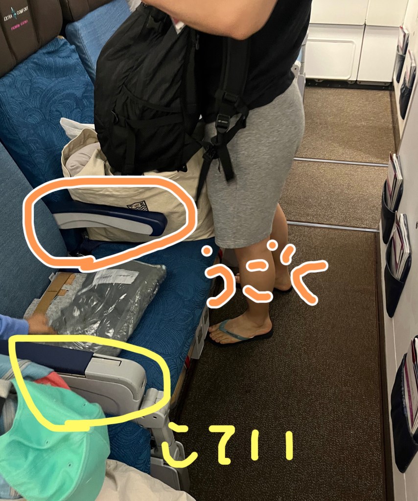 前が壁になっている席はふたつデメリットがあるのですが、①足元に荷物が置けないこと。